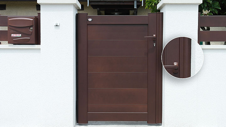 Le portillon aluminium Tschoeppé est conçu comme un portail, avec le même art du détail. Par exemple, Tschoeppé a développé un profilé mouluré exclusif qui bloque le portillon en position fermée, en toute élégance. Les éléments décoratifs comme les inserts alunox ou aspect carbone, les leds, les motifs découpés sont identiques à ceux des portails.